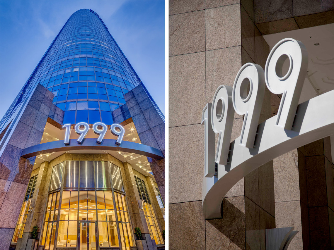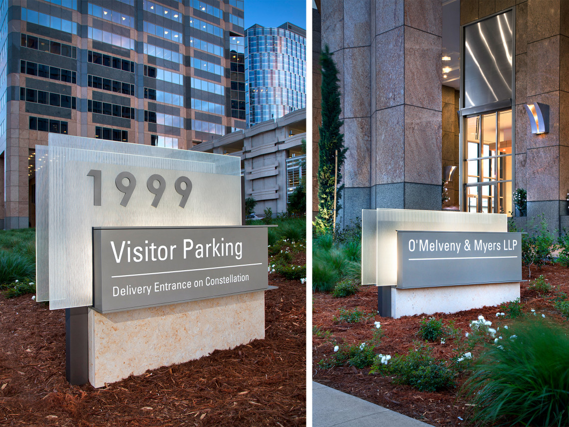 Davies Associates designed new site and on-building signage for this prestigious high-rise office tower located in Century City. As a part of a major ground-level enhancement effort, our design team created new project identification and tenant monument signage featuring edge-lit etched glass panels and back-lit tenant graphics. Updated parking entry, building address and ancillary signage were also developed as a part of the signage scope. In addition, our team designed a distinctive logo for the tower for use by property management on leasing materials and the building website.