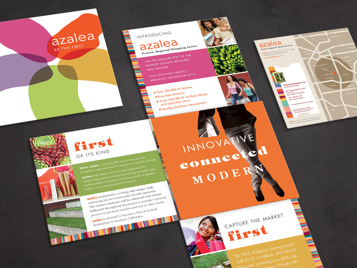 Davies Associates created the brand identity for Azalea, a new contemporary shopping center in South Gate. The name derives from the colorful azalea flower, which is the official symbol of the City. The logo is a contemporary depiction of this beautiful five-petaled bloom. Marketing brochures were created to target potential retailers with a prime expansion opportunity to serve upwardly mobile shoppers in this predominantly Latino consumer marketplace.