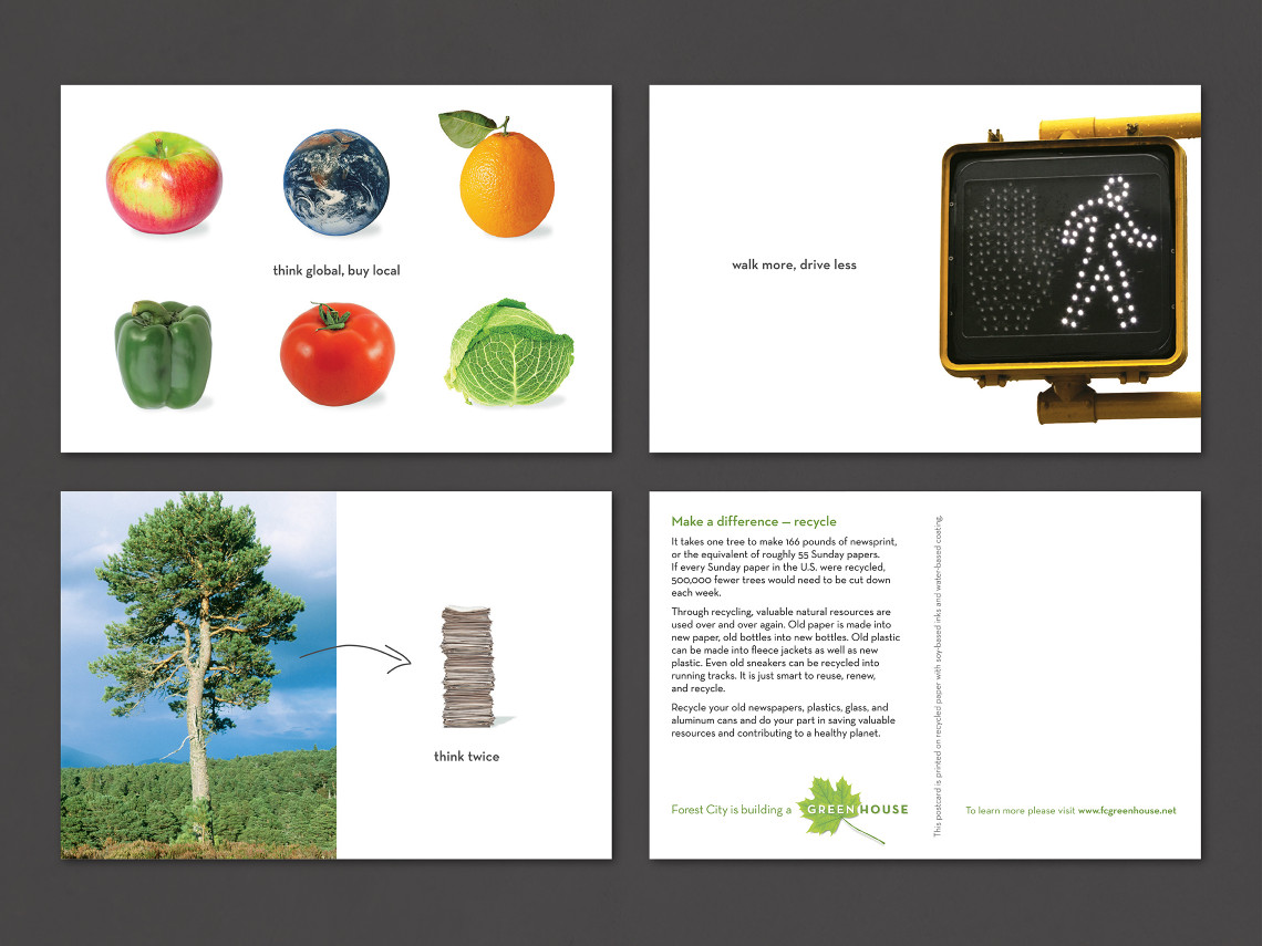 Forest City Residential Management rolled out a new corporate sustainability program to encourage employees and tenants to adopt green practices at home and at work. Davies Associates created the name, designed the logo for Greenhouse, and created a series of postcards and flyers highlighting conservation tips, Earth Day activities and a recycling incentive program.
