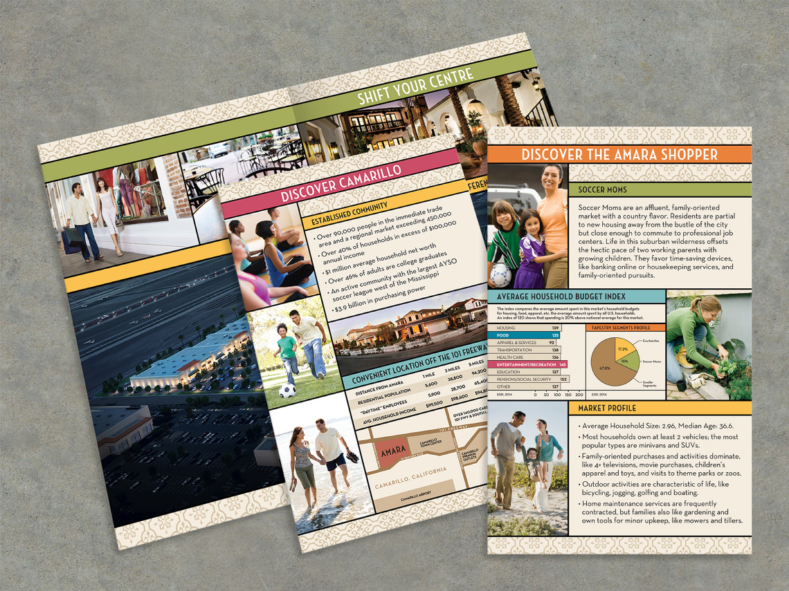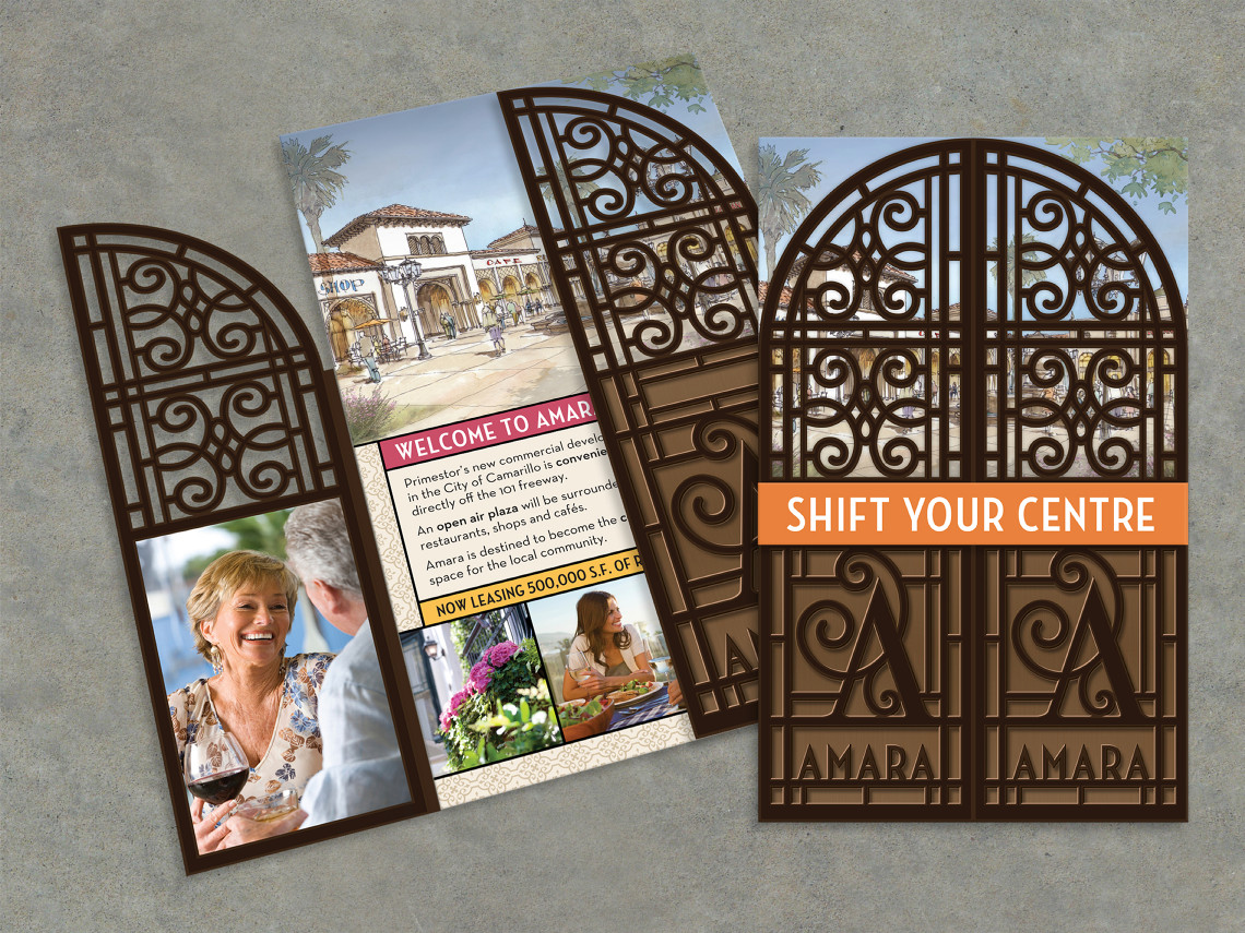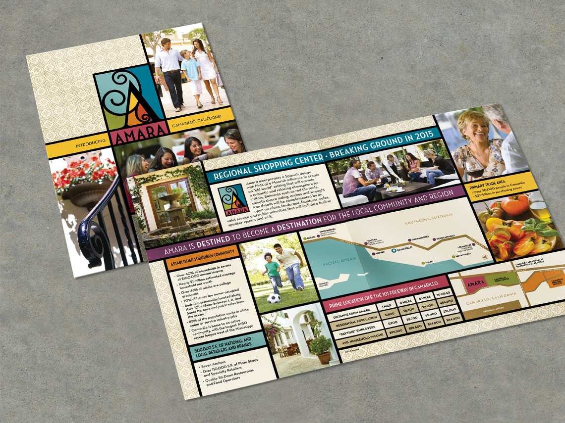 Davies Associates created the new brand identity for Amara, a regional shopping center in development in Camarillo. The logo is inspired by the classical Spanish architectural style of the center, which features wrought iron details, fountains and colorful hand painted tiles. Marketing brochures and other print collateral were created to define the unique aspects of the center and invite potential retailers to discover the advantages of serving this suburban community. A comprehensive signage and graphics program is currently under development for the retail center.