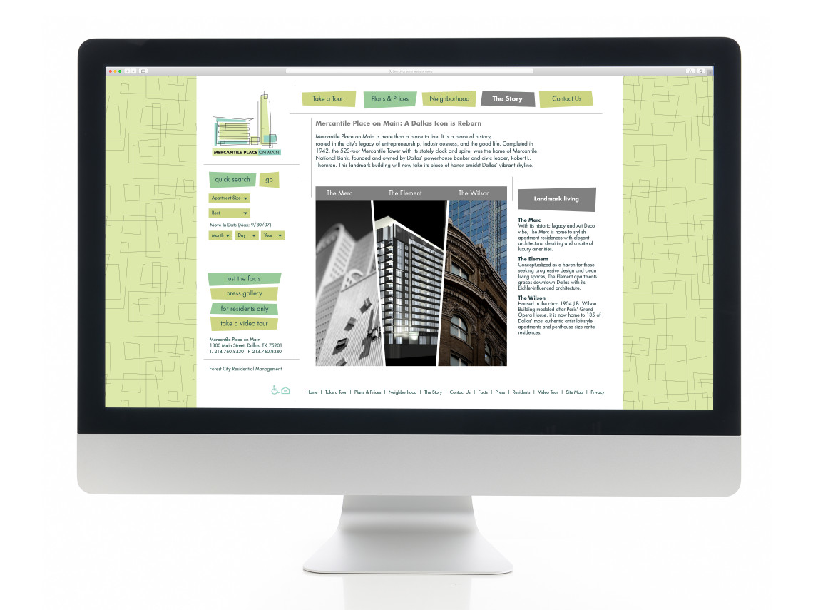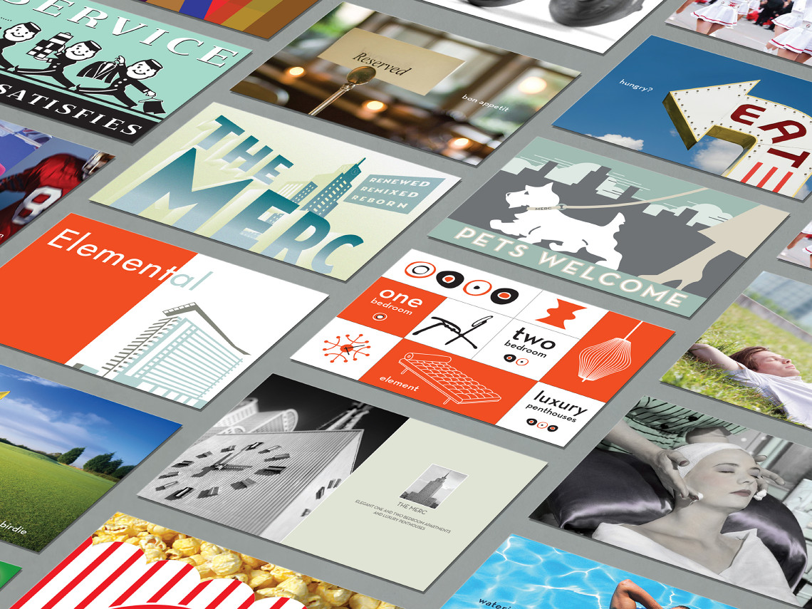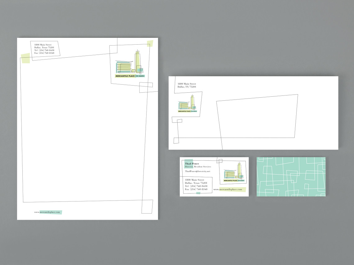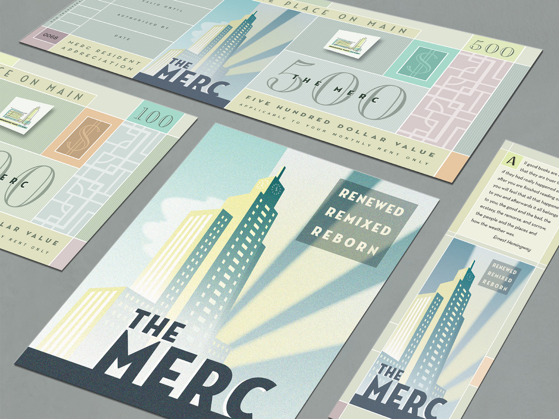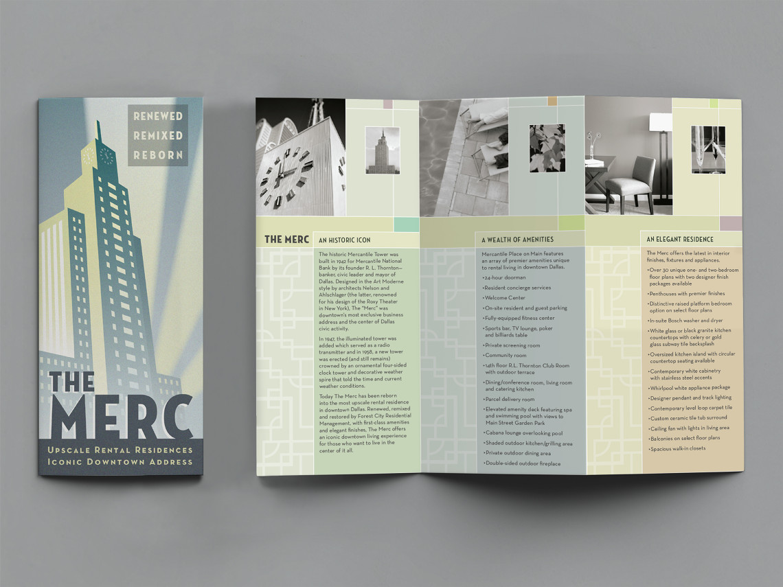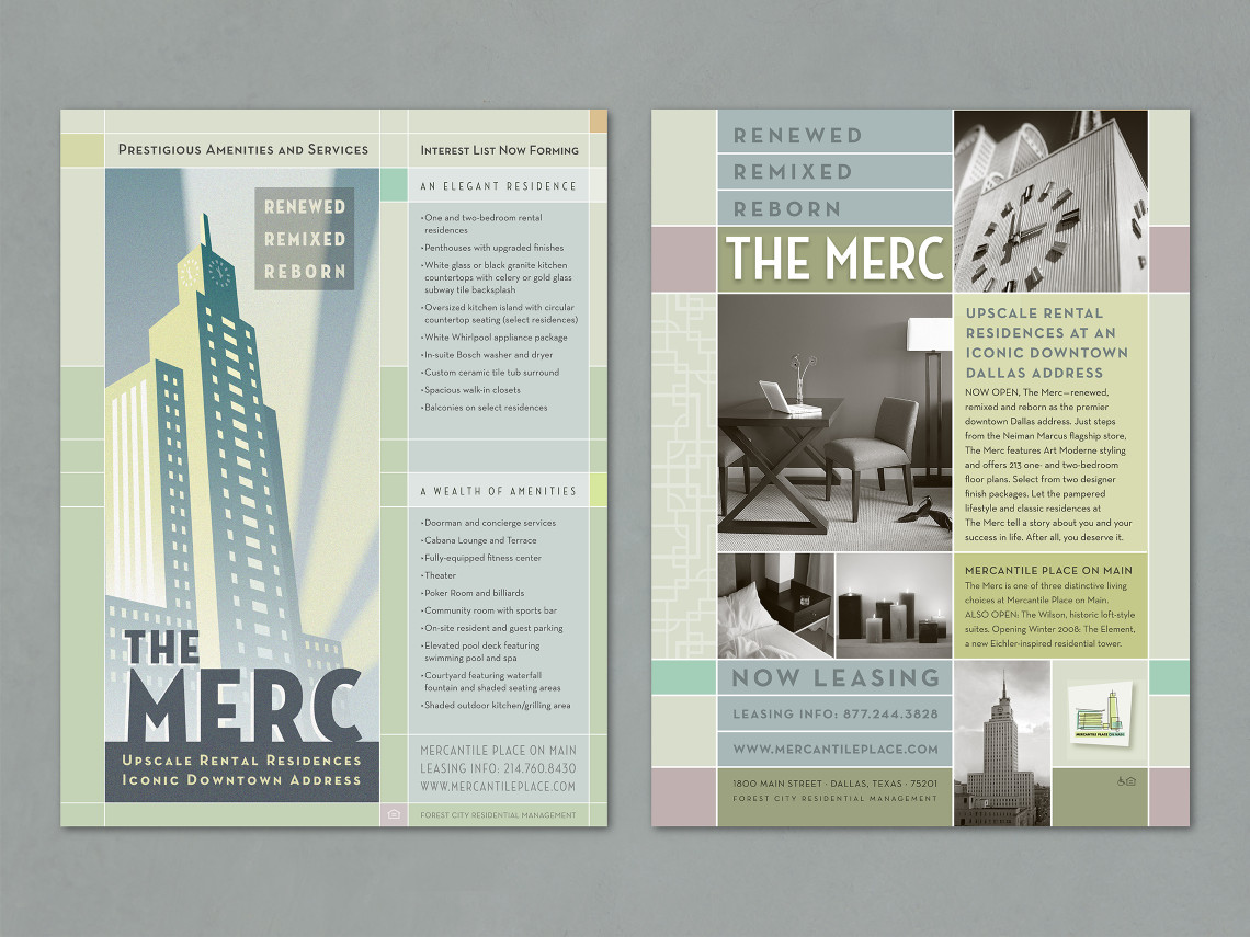 Davies Associates developed the project name, identity, marketing materials and signage program for this urban re-use project in downtown Dallas. The project consists of a landmark Art Deco era tower (The Merc) joined with new construction in Mid-Century Modern style (The Element). While the two buildings share one project identity, the design team created unique marketing graphics and architectural signage for each building reflecting their respective historical styles. The branding program featured stationery, brochures and other print collateral, advertising, and on-site leasing graphics. In addition, a project website was designed to promote the living experiences of the two buildings and highlight the downtown lifestyle.