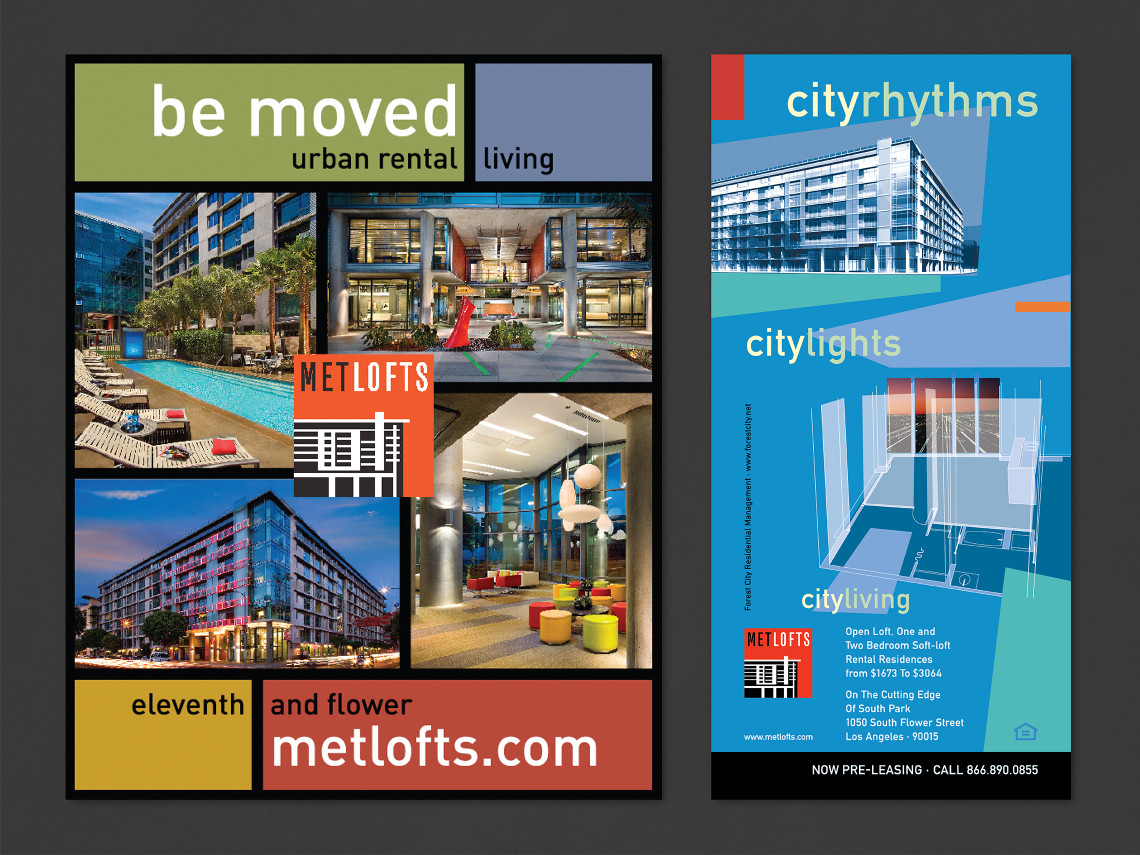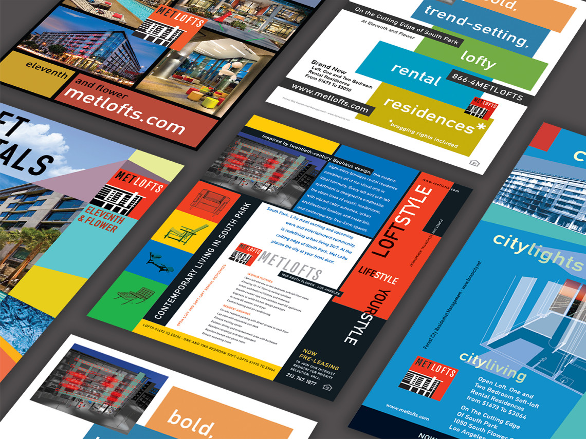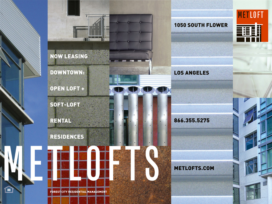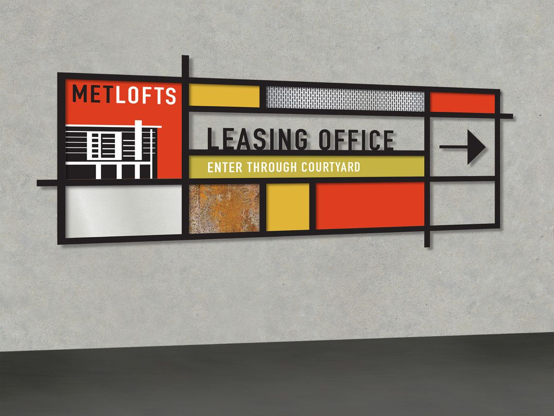 Davies Associates was involved with every aspect of the graphic design, branding and signage for this new loft-style rental property in downtown Los Angeles. After developing the project name, the team worked with twentieth-century Bauhaus inspired elements to develop the logo, collateral materials, website, advertising, leasing displays and project signage. The signage and graphics employ a unique mix of materials and forms that complement the urban architecture and reinforce project branding.