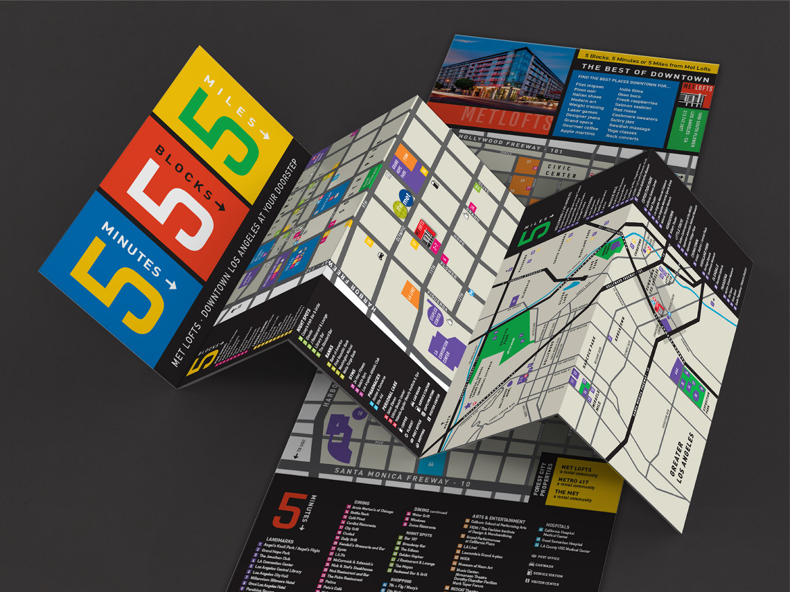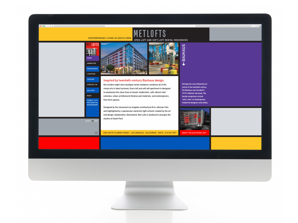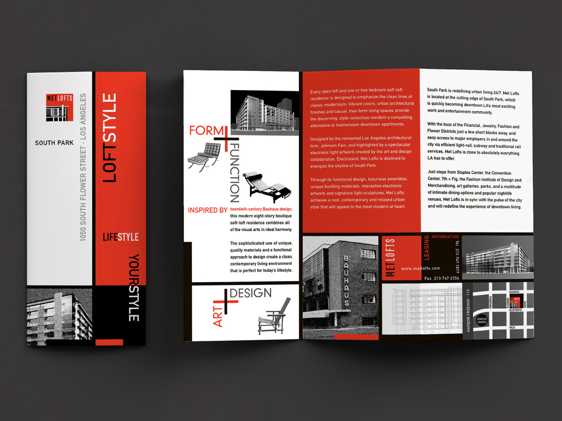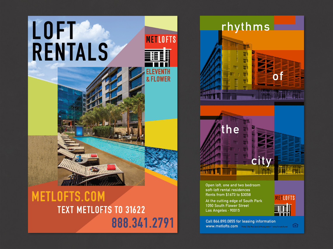 Davies Associates was involved with every aspect of the graphic design, branding and signage for this new loft-style rental property in downtown Los Angeles. After developing the project name, the team worked with twentieth-century Bauhaus inspired elements to develop the logo, collateral materials, website, advertising, leasing displays and project signage. The signage and graphics employ a unique mix of materials and forms that complement the urban architecture and reinforce project branding.
