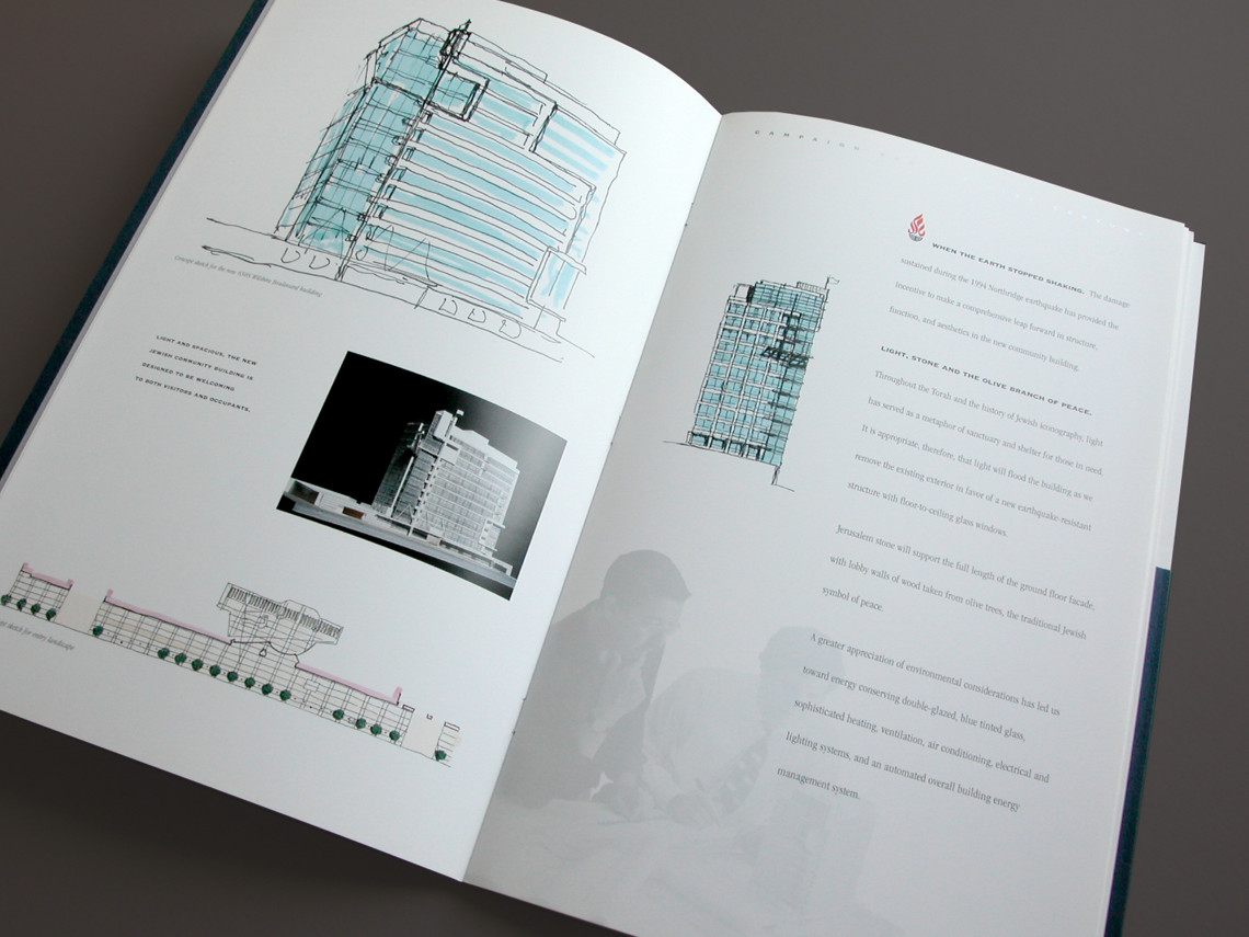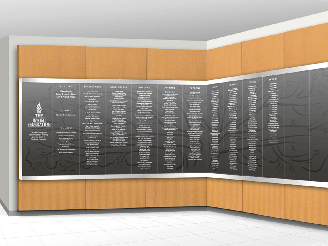 Davies Associates collaborated with the building architect and interior architect on the development of a comprehensive exterior and interior signage/graphics program for the high-rise headquarters of The Jewish Federation of Greater Los Angeles located at 6505 Wilshire Boulevard. The exterior signage included project identification on the building parapet, addressing, parking entrance signage and ground level project identification signage and graphics. The interior program consisted of room/area identification signage, donor recognition signage and graphic wall treatments within the ground floor lobby areas. Our design team also created the capital campaign brochure and stationery to enhance fundraising efforts.