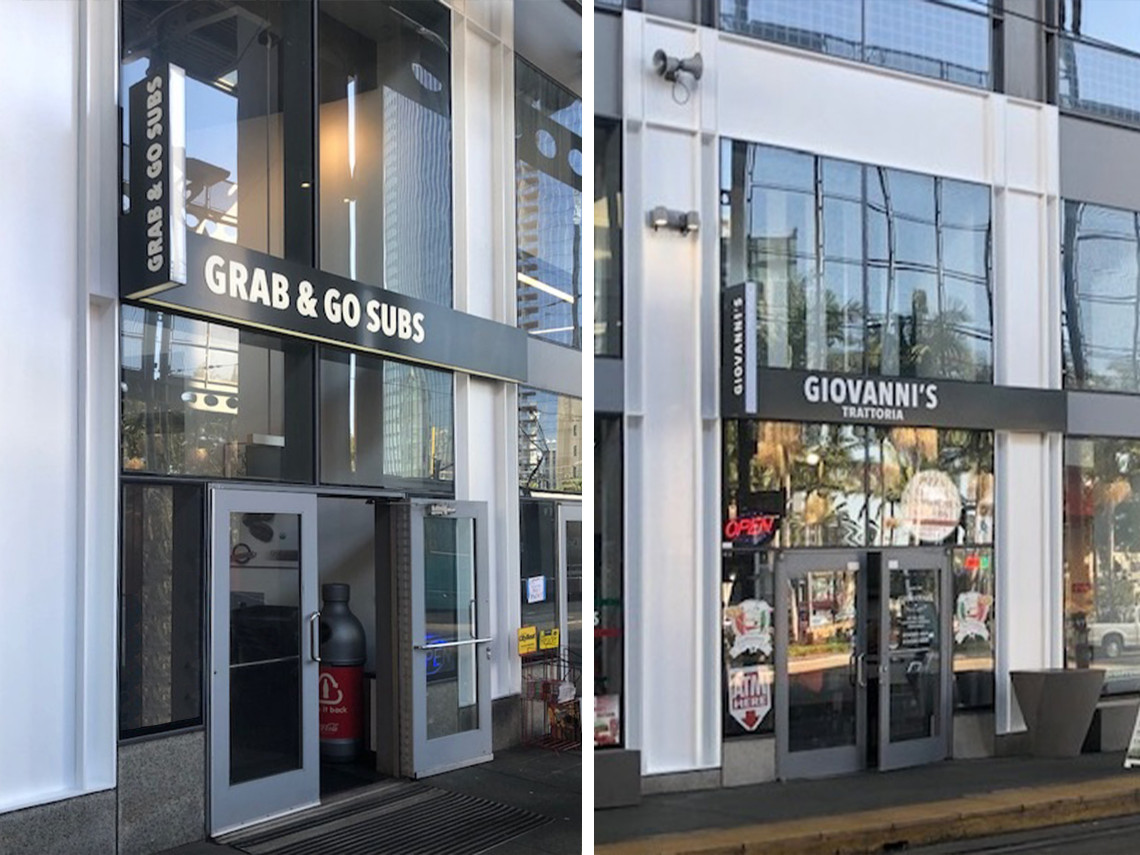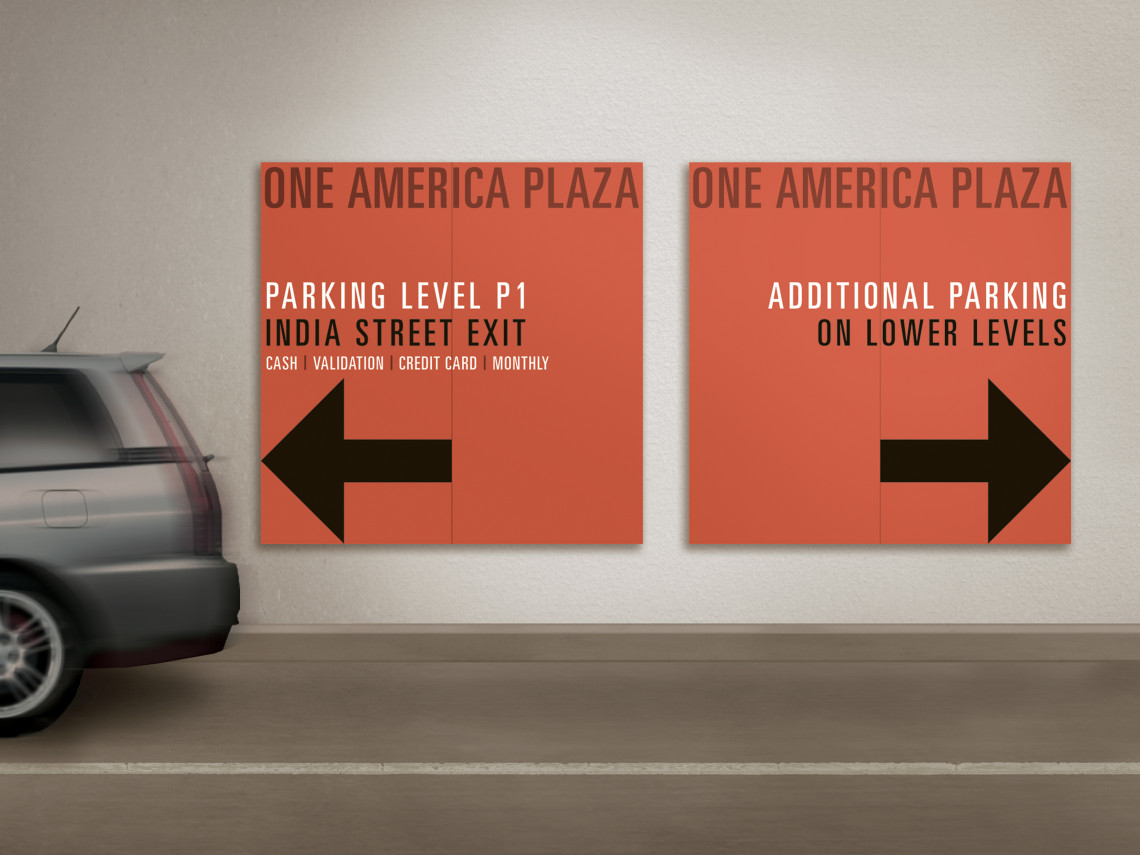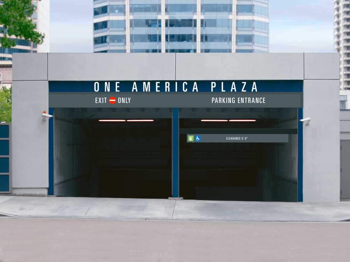 Davies Associates created interior and exterior signage and graphics for this 34-story office tower as part of an ongoing reinvestment project. The site includes a four-level subterranean parking garage and ground floor retail spaces, some of which face the adjacent San Diego trolley stop. In addition to designing a comprehensive signage/graphics program for the parking garage, the project team collaborated with the reinvestment architect to create standards/criteria for ground floor retail storefront signage consisting of sign panels and blade signs as part of the storefront improvements.